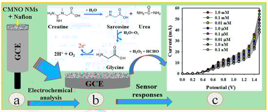 - Rahman, M.M.; Alam, M.M.; Asiri, A.M.; Opo, F. An Electrochemical Approach for the Selective Detection of Cancer Metabolic Creatine Biomarker with Porous Nano-Formulated CMNO Materials Decorated Glassy Carbon Electrode. Sensors 2020, 20, 7060. [Google Scholar] [CrossRef] [PubMed]