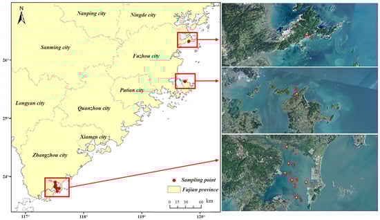 Distribution map of sampling and monitoring sites along the coast of Fujian Province.