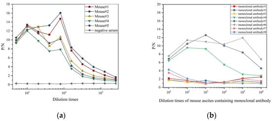 The titer of polyclonal antibodies and monoclonal antibodies against Alexandrium tamarense: (a) the titer of polyclonal antibodies against Alexandrium tamarense and (b) the titer of monoclonal antibodies against Alexandrium tamarense.