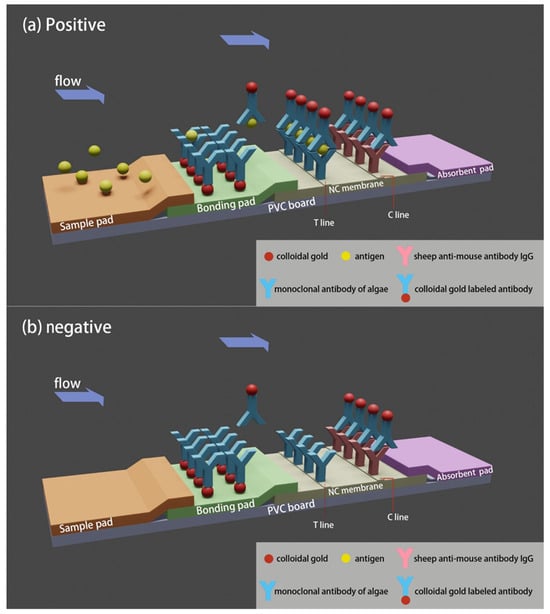 As illustrated in Figure 4, the design of the test strip is anchored on a PVC support base. Adjacent to it is a glass fiber membrane serving as the sample pad, while the nitrocellulose (NC) membrane functions as the central detection zone. Sequentially adhered to the PVC base are the glass fiber sample pad and the conjugate pad, which contains monoclonal antibodies conjugated with colloidal gold specifically targeting Alexandrium tamarense. The NC membrane is meticulously coated at two distinct positions: the test line (T-line), harboring monoclonal antibodies specific to the algae, and the control line (C-line), coated with anti-mouse IgG antibodies. As shown in Figure 4a, upon adding a sample, it traverses the filter membrane through wicking action. If the sample contains the antigen, it will initially bind to the gold-labeled antibodies present in the glass fiber sample layer, forming a conjugate comprising the antigen, gold, and labeled antibody. This conjugate then migrates further and encounters the monoclonal antibodies specific to the target algae, forming a dual-antibody sandwich complex. The complex consists of a monoclonal antibody, an antigen, and a gold-labeled antibody, which triggers the staining of the T-line, thereby indicating a positive test result. Any excess gold-conjugated antibody will continue to diffuse and bind to the goat anti-mouse IgG antibody, resulting in C-line staining. Consequently, a positive test outcome is indicated. In contrast, as shown in Figure 4b, if the antigen is absent from the sample, the gold-labeled antibodies cannot bind to form a conjugate with the antigen and will not interact with the monoclonal antibodies specific to the algae at the T-line. In this scenario, the T-line remains colorless, whereas the C-line alone exhibits coloration due to the binding of the goat anti-mouse IgG antibodies with the gold-labeled antibodies, indicating a negative test result.
