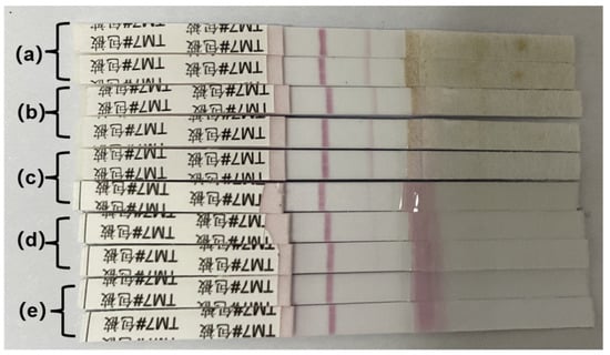 The sensitivity result of Alexandrium tamarense test strips. The concentration of Alexandrium tamarense (each group had two test strips set up for replication): (a) 2.78 × 105 cells/mL; (b) 1.39 × 105 cells /mL; (c) 5.56 × 104 cells/mL; (d) 2.78 × 104 cells/mL; (e) 2.78 × 103 cells /mL.