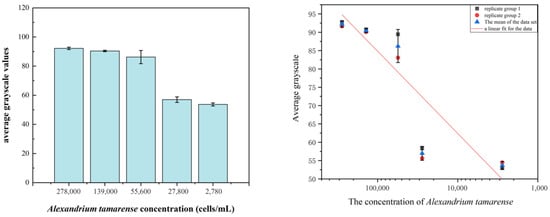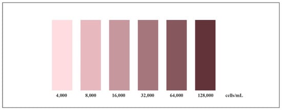The detection results elucidating the sensitivity of the Alexandrium tamarense test strip are graphically represented as follows: Figure 6d at a detection concentration of 2.78 × 104 cells/mL, the T-line of the test strip exhibits a subtle coloration. Conversely, at a detection concentration of 2.78 × 103 cells/mL, the T-line of the test strip fails to manifest any coloration (Figure 6e). This observation implies that the detection limit for the Alexandrium tamarense test strip is approximately 2.78 × 104 cells/mL. The grayscale scanning outcomes reveal that the intensity of T-line coloration diminishes as the concentration of Alexandrium tamarense decreases. When encountering higher concentrations, the variance in T-line coloration is notably less pronounced. Relying on the average grayscale data (Figure 7) derived from the scans, a standard curve delineating the relationship between the average grayscale values and algal concentration can be constructed. According to this standard curve, a standard colorimetric chart for Alexandrium tamarense (Figure 8) was developed. This facilitates the determination of the concentration range of the tested Alexandrium tamarense through a simple visual assessment of the test strip’s coloration.