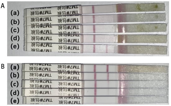 (A) Specific detection results of Alexandrium tamarense: (a) Karenia mikimotoi; (b) Gymnodinium catenatum; (c) Skeletonema costatum; (d) Prorocentrum donghaiense; (e) Alexandrium catenella. (B) Results of using Alexandrium tamarense test strips to detect different concentrations of Alexandrium catenella. The concentration of Alexandrium catenella: (a) 2.22 × 105 cells/mL (b) 2.22 × 104 cells/mL; (c) 2.22 × 103 cells/mL; (d) 2.22 × 102 cells/mL; (e) 111 cells/mL.