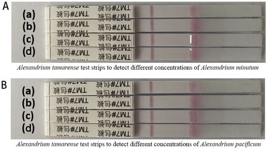 Results of using Alexandrium tamarense test strips to detect different concentrations of Alexandrium minutum and Alexandrium pacificum: (A) the concentration of Alexandrium minutum; (a) 6 × 104 cells/mL; (b) 6 × 103 cells/mL; (c) 6 × 102 cells/mL; (d) 60 cells/mL. (B) The concentration of Alexandrium pacificum: (a) 1.8 × 104 cells/mL; (b) 1.8 × 103 cells/mL; (c) 1.8 × 102 cells/mL; (d) 18 cells/mL.