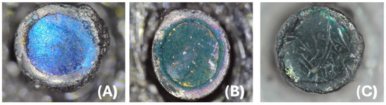 (A) Optical microscopy picture of an SNG-C electrode surface modified with PEDOT:PSS (layer-by-layer method). (B) An SNG-C-PEDOT:PSS/PANI electrode surface (layer-by-layer method). (C) An SNG-C-PEDOT:PSS/PANI electrode surface (copolymerization method).