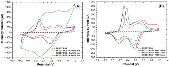 Briefly, electrodeposited PANI usually has two anodic and cathodic peaks, located around 0.3 V/0.8 V and 0.1/0.65 V, respectively. These peaks are associated with the reversible redox transformation of the polymer. The first peaks located around 0.1/0.3 V are attributed to the phase change between leucoemeraldine and emeraldine. In the same way, peaks around 0.65/0.8 V correspond to the transformation between emeraldine and pernigraniline [32]. High peaks provide information about the thickness of the deposited polymer layer. A higher peak means that a greater amount of PANI has been deposited on the surface of the electrode. In Figure 2, it can be observed that, the longer the electrodeposition time of PEDOT:PSS, the greater the amount of PANI is deposited. This fact could be attributed to an increase in electrostatic interactions between PEDOT:PSS and PANI [33]. Even though the voltammogram in Figure 2A showed 20 min of deposition, the peaks cannot be observed clearly. This ought to be achieved by the redox process of secondary products formed during the aniline polymerization, as explained in the literature [34]. This effect could also be attributed to possible interactions between PANI electrodeposited chains on the electrode surface. The material might exhibit a partially crystalline structure, with disordered regions formed by intercalated chains typically embedded within the more ordered domains, which could account for the observed interactions.