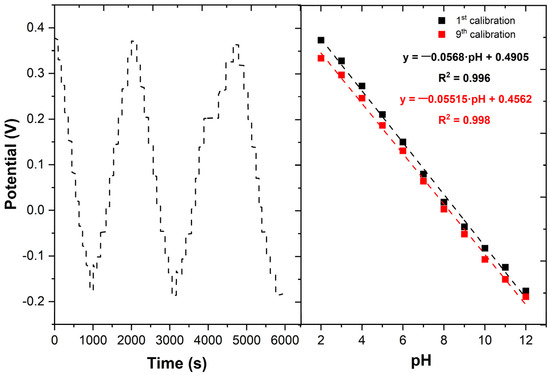 To study the behavior of the sensor in a specific pH range, different standard solutions were prepared. All the measurements were performed by chronopotentiometry at room temperature using a universal buffer Britton–Robinson (BR) solution (0.04 M). The pH was adjusted with sodium hydroxide, ranging from 2–12. In order to assess the quality of the pH probes, different figures of merit, like repeatability, reproducibility, and reversibility, were chosen.