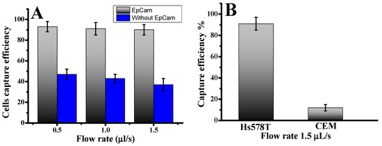 Approximately 1000 fluorescence-labeled Hs578t cells were infused into the device to investigate CTC capture using our microfluidic laminar flow device. The diameters of Hs578t cells were 13.0 ± 4.0 µm. The results illustrate the cell capture ratios with an anti-EpCAM-coated LFA device and without under varying flow rates. The cell capture patterns in the anti-EpCAM-coated LFA device were compared to those in an LFA device without anti-EpCAM coating. As illustrated in Figure 1A, cell capture peaks at varying infused flow rates were consistently located between the 15.7 µm and 12.3 µm filter zones, where the filter pore sizes were smaller than the cell diameters [28]. Without anti-EpCAM immobilization, the LFA device exhibited low circulating tumor cell capture efficiency (Figure 1), capturing only 38–43% of both cell types even at a low flow rate of 0.5 µL/s. In contrast, functionalizing the chip with anti-EpCAM dramatically improved capture efficiency. The capture efficiency rose to 93.0 ± 3.0% at 0.5 µL/s. This significant enhancement underscores the predominance of affinity-based mechanisms in cell capture when using an anti-EpCAM functionalized LFA device. Such results demonstrate the critical role of EpCAM-mediated binding in overcoming limitations of size-exclusion-based capture. Previous studies have also highlighted the superior performance of EpCAM-functionalized platforms in isolating CTCs with high specificity and efficiency, particularly at lower flow rates, where binding kinetics are more favorable [28]. The CTC capture efficiency in the microfluidic system was determined using the formula: Cf/Cs × 100%, where Cf represents the number of cancer cells identified under a fluorescence microscope, and Cs is the total number of cancer cells added to the DPBS buffer. These results confirm the effectiveness of combining size-based filtration with antibody-mediated affinity capture, providing a more effective and accurate strategy for CTC isolation.