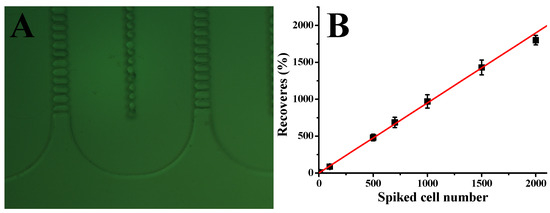 (A) Picture showing the shape of lateral filters. (B) Calibration plot of Hs578t cell capture from whole blood with different cell concentrations at 1.5 μL/s; solid lines represent linear fitting. Error bars represent standard deviations (n = 3).