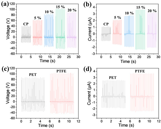 Figure 3 shows the output voltage and current of the device, where we studied several parameters such as various concentrations of CP/BTO materials and different electronegative layers. We developed four tribopositive layers with varying amounts of BTO in the copy paper: 5%, 10%, 15%, and 20%. As shown in Figure 3a,b, the performance of the triboelectric nanogenerator increased as the BTO concentration increased from 5% to 20%. The bare copy paper generated 40 V and 1.1 µA, 5% BTO generated 62 V and 2.1 µA, 10% BTO generated 84 V and 2.7 µA, 15% BTO generated 103 V and 3.6 µA, and 20% BTO generated 90 V and 3.1 µA. These results suggest that CP/BTO is a promising candidate for developing efficient triboelectric nanogenerators. The increase in performance with BTO concentration can be attributed to the enhanced dielectric properties of BTO, which facilitate greater charge accumulation and separation during the contact–separation cycles. The BTO material layer significantly enhances the paper’s ability to withstand high mechanical pressure, providing greater durability and stability. However, at 20% BTO, performance was slightly decreased, due to excessive BTO concentration impacting the material’s durability and stability. The performance of the triboelectric nanogenerator depends not only on the tribopositive materials but also on the tribonegative material. In Figure 3c,d, we compared two electronegative layers: PET and PTFE. The CP/BTO with PET device generated 87 V and 2.5 µA, while the CP/BTO with PTFE produced 103 V and 3.6 µA. The CP/BTO with PTFE device generated a higher output due to the greater potential difference between the tribopositive and tribonegative layers. Additionally, fluorinated materials like PTFE possess higher tribonegativity, resulting in a more significant charge transfer during the interaction [47]. This highlights the importance of selecting the appropriate triboelectric pairs to maximize the performance of TENGs. The combination of optimal CP/BTO concentration with appropriate tribonegative materials like PTFE can significantly enhance the energy output of the device, making it a highly efficient triboelectric nanogenerator.