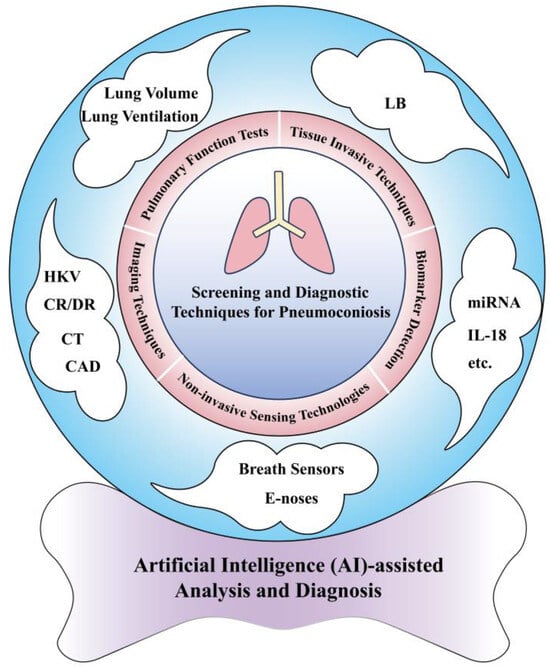Screening and diagnostic techniques for pneumoconiosis include imaging techniques (high-kV (HKV) X-ray imaging, computed radiography (CR), direct digital radiography (DR), computed tomography (CT), computer-aided diagnosis (CAD)), PFT, tissue-invasive techniques (lung biopsy (LB)), biomarker detection (miRNA, IL-18, etc.), and non-invasive sensing technologies (breath sensors and E-noses).