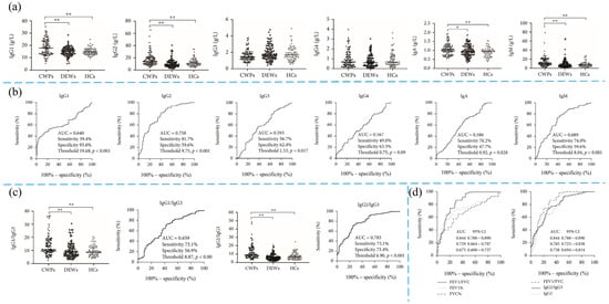 (a) Comparison of serum concentrations of IgG1, IgG2, IgG3, IgG4, IgA, and IgM among the study groups, * p < 0.05, ** p < 0.01. (b) The ROC curve analysis of immunoglobulin test results between coal workers’ pneumoconiosis and dust-exposed workers. (c) Comparison of the IgG1/IgG3 ratio and IgG2/IgG3 ratio among the study groups. (d) ROC analysis of the spirometry parameters and the IgG2/IgG3 ratio for distinguishing coal workers’ pneumoconiosis and dust-exposed workers [6].
