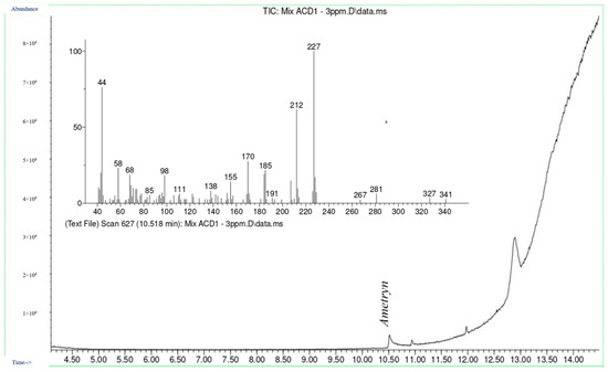 (a) Chromatogram in SCAN mode of the sample without AMT. (b) Chromatogram in SCAN mode of a sample spiked with 1 mg L−1 of AMT. (c) SIM mode (m/z = 227; m/z = 44) chromatogram of a sample spiked with 1 mg L−1 of AMT.
