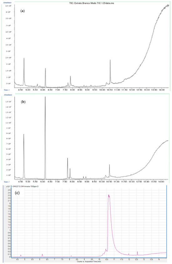 To assess the selectivity, chromatograms of the matrix without AMT (Figure 2a) were compared to those spiked with 1 mg L−1 of the target pesticide (Figure 2b). This comparison revealed that, during the herbicide’s retention time, the target peak was masked by the 7,6-Di-tert-butyl-1-oxaspiro(4,5)deca-6,9-diene-2,8-dione component from the sample matrix that eluted on the same retention time of the analyte (about 10.5 min), showing that the SCAN mode does not provide adequate selectivity, with the matrix components potentially leading to “false-positive” results.