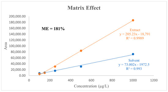 where represents the slope of the calibration curve prepared in the presence of the sample matrix and represents the slope of the calibration curve prepared in the solvent. If the value falls outside the range −20% to 20%, it indicates the presence of a matrix effect; therefore, for an accurate quantitative analysis, the calibration curve in the matrix should be used [18].