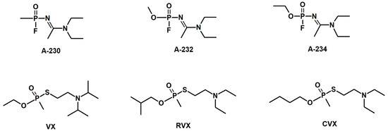 Structural formulas of A- and V-group NAs: A-230, Methyl-(1-(diethylamino)ethylidene) phosphonamidofluoridate; A-232, Methyl-(1-(diethylamino)ethylidene) phosphoramidofluoridate; A-234, Ethyl-(1-(diethylamino)ethylidene) phosphoramidofluoridate; VX, O-ethyl-S-2-diisopropyl-aminoethyl-methylphosphonothiolate; RVX, O-isobutyl-S-2-diethylaminoethyl-methylphosphono-thiolate; and CVX, O-butyl-S-2-diethylaminoethyl-methylphosphonothiolate.