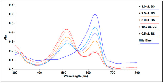 Shifting of UV-Vis absorption spectra of Nile Blue A after addition of a weak alkaline solution, 10% Na2CO3 of the volume 0.5, 1.0, 2.5, 5.0, and 10.0 µL.
