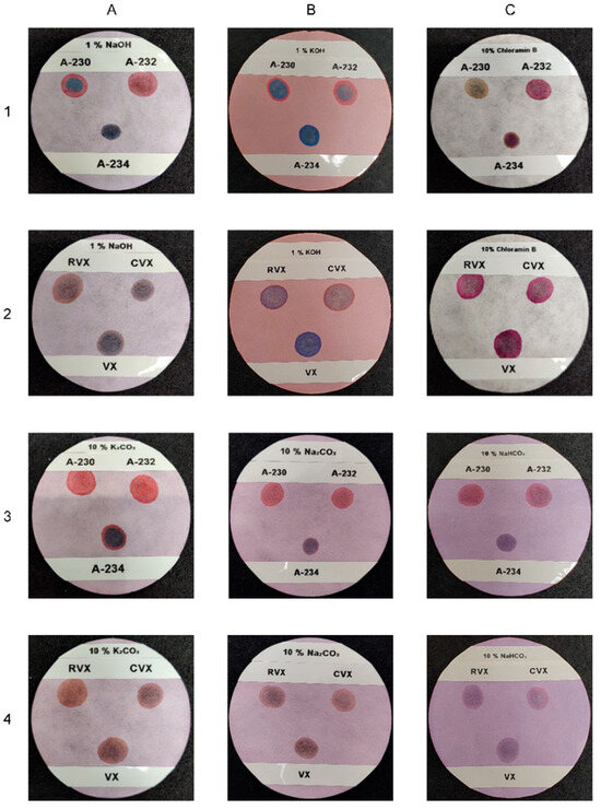 Generally, all NAs of interest demonstrated either detectable and/or well-visible colour spots at the concentration levels of 1% and higher, regardless of the visualization method used. On the other hand, the concentration level of 0.1% did not demonstrate such unambiguous results; reliable colour responses detectable by the naked eye were observed only in the case of A-232, VX, and CVX compounds, corresponding to concentrations in the interval of 4–9 mM. The A-230, A-234, and RVX compounds produced insignificant colouring on the exposed strip detectors; therefore, they had not been reliably detected at 0.1% concentration levels.