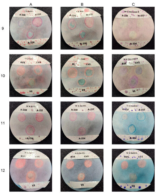 The SPRAY visualization method did not demonstrate significant or such readily observable colour transitions. Nevertheless, by employing this visualization method, it was feasible to distinguish within the relevant group of NAs, e.g., in the case of A-232 by using 1% hydroxide solutions (Figure 8(B9)) or the RVX compound, respectively (Figure 8(A10,B10)). In the case of using the 10% sodium bicarbonate solution for the SPRAY visualization method, it was also possible to differentiate the A-group compounds from the V-group compounds; however, it was not possible to distinguish the single representatives of these groups. The V-group compounds produced homogeneous red–purple spots on the strip detectors (Figure 8(C12)), whereas the compounds of the A-group demonstrated completely different colour transitions, namely spots with light centres and blue rims around the edges (Figure 8(C11)).