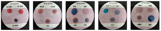The similar differences among the colour transitions of the respective NAs and other CWAs of interest have been observed in the DRY visualization procedure by using the 10% K2CO3 solution (Figure 10). In this case, characteristic red–blue circles were formed through the application of GA, GD, and GF.