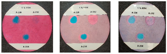 Particularly in the case of the DRY and WET visualization methods, these colourings were very observable, even when assessed subjectively by the naked eye. For the distinction of single analytes within the same group, the use of 1% hydroxide solutions appears to be particularly effective. When the 1% NaOH visualization solution was applied as a colour change developer, it was even possible to differentiate single compounds of the A-group, as each of them produced a different colouring on the strip detector. While A-230 created characteristic spots with blue centres and red–purple edges using the 1% NaOH solution, A-232 and A-234 showed spots of homogeneous colouring—red in the case of A-232 and dark blue for A-234 (Figure 6(A1)). Also, using the 1% KOH solution enabled the distinction between the single representatives of A-group compounds, such as A-234, demonstrated by the characteristic homogeneous dark blue spots, and the other A-group compounds, which produced spots with blue centres and red–purple edges (Figure 6(B1)). Moreover, there was the possibility to distinguish single compounds of interest within the group of the relevant NAs, such as A-230 using the 10% chloramine B visualization solution (Figure 6(C1)), or A-234 by employing 10% carbonate solutions (Figure 6(A3,B3,C3)). The visualization solutions of the carbonate and chloramine base generally proved less efficient in the creation of characteristic colour reactions compared to hydroxide solutions.