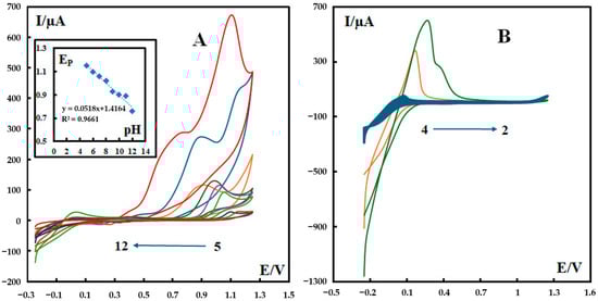 Effect of pH on the CVs of 600 nM metformin recorded in 0.1 M phosphate buffer solution at a scan rate of 100 mV s−1 at different pH values at the surface of P-g-C3N4/MOF-199/CPE. Panel (A) shows the cyclic voltammograms related to pH values in the range of 5 to 12, and its inset shows the variation in peak potential versus pH values. Panel (B) shows the cyclic voltammograms related to pH values in the range of 2 to 4. The colored curves represent the CV results of the testing solution with a pH value of 5–12 (from right to left) in panel (A) and 2–4 (from right to left) in panel (B), respectively.