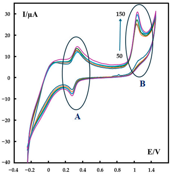 Cyclic voltammograms of 600 nM metformin in phosphate buffer solution (pH 7) at different scan rates (50–150 mV s−1) further support this proposed mechanism. As shown in Figure 6, two electrooxidation peaks appear in the CV curves: Part A is related to the second oxidation–reduction reaction given in Scheme 1, and Part B is related to the first oxidation in this scheme.