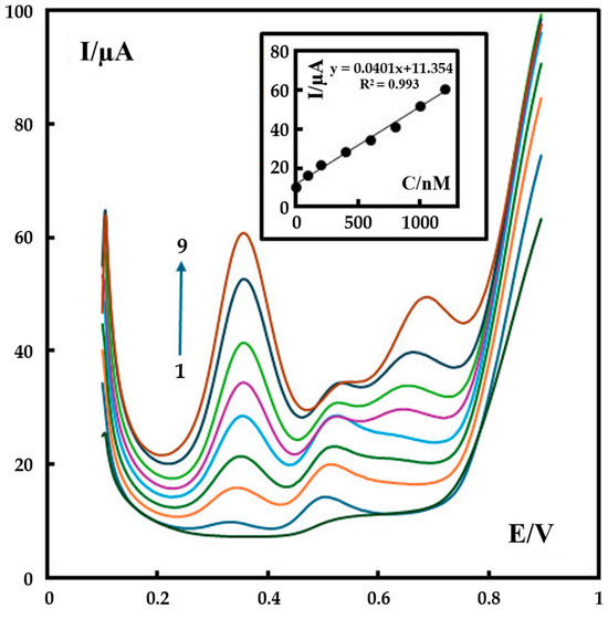Differential pulse voltammetry (DPV) with a pulse amplitude of 50 mV, a pulse width of 40 ms, and a scan rate of 60 mV s−1 was used for the determination of metformin on the surface of P-g-C3N4/MOF-199/CPE. For the first peak, the calibration curve was established with the linear ranges of 0.5 to 1200 nM metformin (inset of Figure 7). The corresponding regression equation (Equation (3)) is: