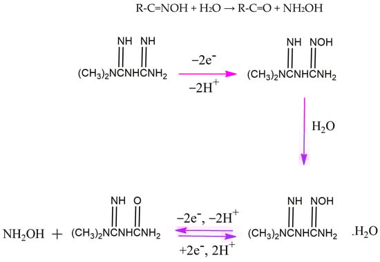 As can be seen in the inset of Figure 5A, the Ep value shifts negatively with the increase in the solution pH and the slope of the linear regression in the range of pH values from 5 to 12 (−0.0518 mV pH−1), very close to the theoretical value of −0.059 mV pH−1. This is consistent with the proposed mechanism for the electrooxidation of metformin based on our serial study [10,24,26,28] with equal numbers of electrons and protons. In our proposed mechanism (Scheme 1), the first step is an irreversible reaction losing two electrons and two protons. After interacting with water molecules (Step 2), the intermediate compound experiences a reversible reaction that also involves two electrons and two protons. In the third step, oxime is hydrolyzed into the corresponding carbonyl compound and hydroxylamine. The hydrolysis of oxime involves a serial reaction, including the protonation of oxime, the formation of a carbocation, water attack on the carbocation, and deprotonation. The overall reaction can be summarized as follows: