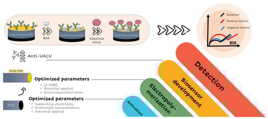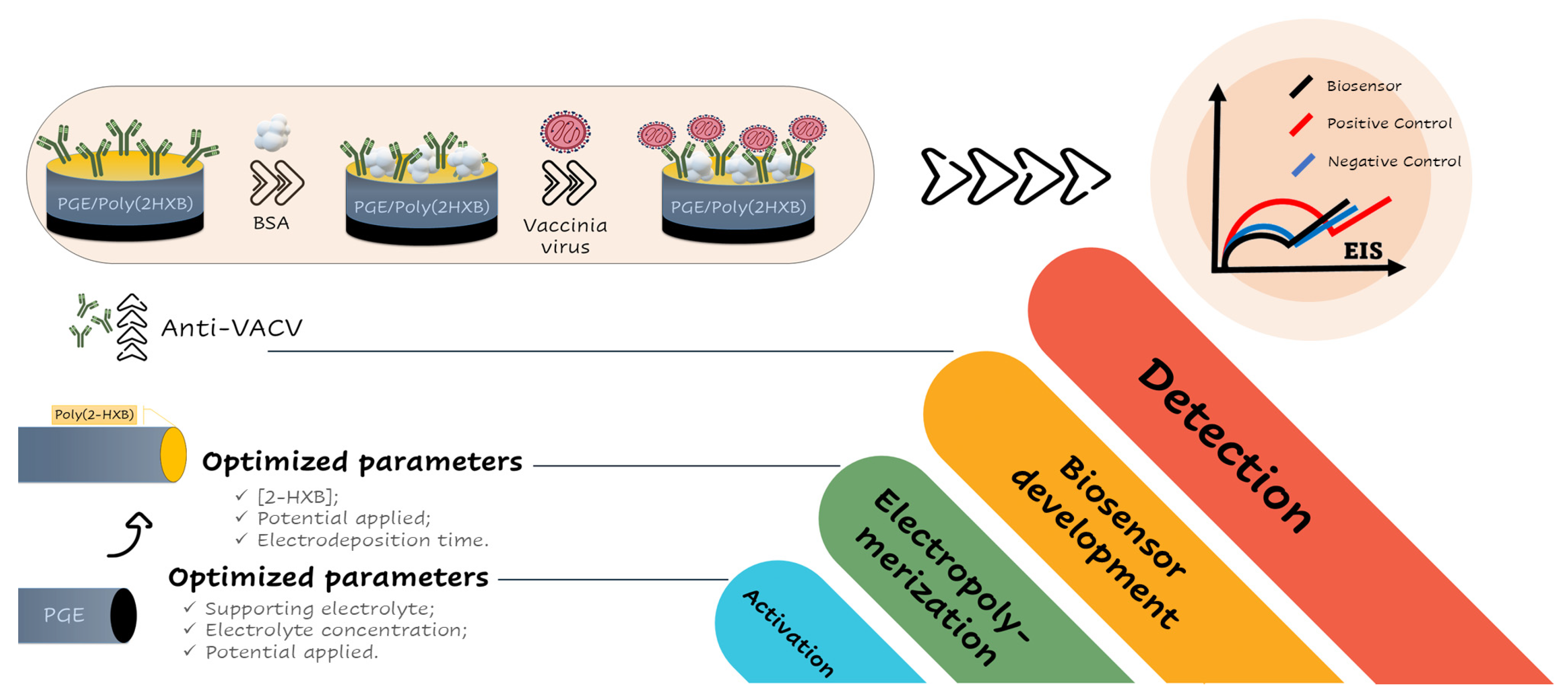 VACV is typically associated with skin infections and their dissemination in rural areas, particularly in regions with intensive agricultural practices. Despite their importance in epidemiology, current detection techniques have limitations for field use, emphasizing the need for new approaches that combine accuracy, speed, and cost-effectiveness. Therefore, this study aimed to address some of these gaps by investigating PGE pretreatment and applying it in initial studies to develop an immunosensor for VACV. In addition, electrode modification was evaluated by electropolymerization with a polymeric film (PF) derived from 2-hydroxybenzamide (2-HXB), which was previously studied by the research group and proved to be effective for this purpose [37]. The study specifically focused on evaluating the impacts of the electrochemical pretreatment effects of PGEs, such as the applied potential and duration, as well as the type and concentration of the supporting electrolyte used. Moreover, it optimized the parameters of electrode functionalization with PF, including the applied potential, deposition time, and monomer concentration. This investigation may lead to new possibilities for portable and automated applications for VACV detection and applications of these transducers in biosensing.