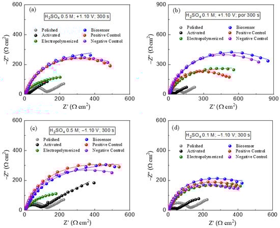Nyquist diagrams are obtained for each stage in the development of the immunosensor, including the interaction with the controls (PC and NC) by varying the concentration of H2SO4 and the applied potential. Anodic treatment at +1.10 V for 300 s in (a) 0.50 M of H2SO4 and (b) 0.10 M of H2SO4. Cathodic treatment at −1.10 V for 300 s in (c) 0.50 M of H2SO4 and (d) 0.10 M of H2SO4. The solid lines represent the fit to the experimental data (symbols) obtained using the proposed equivalent circuit.