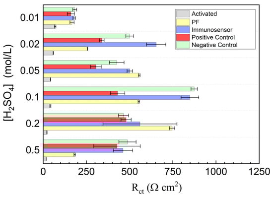 Relation of the Rct values obtained for each stage in the development of the immunosensor, including the interaction with the controls (positive and negative) as a function of the concentration of H2SO4, keeping the applied potential at +1.10 V (300 s).