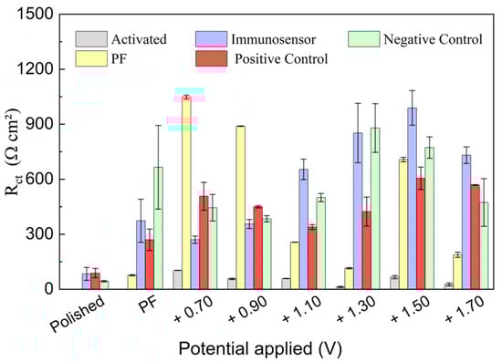 Relation of the Rct values obtained for each stage in the development of the immunosensor, including the interaction with the controls, by varying the potential applied during PGE activation.