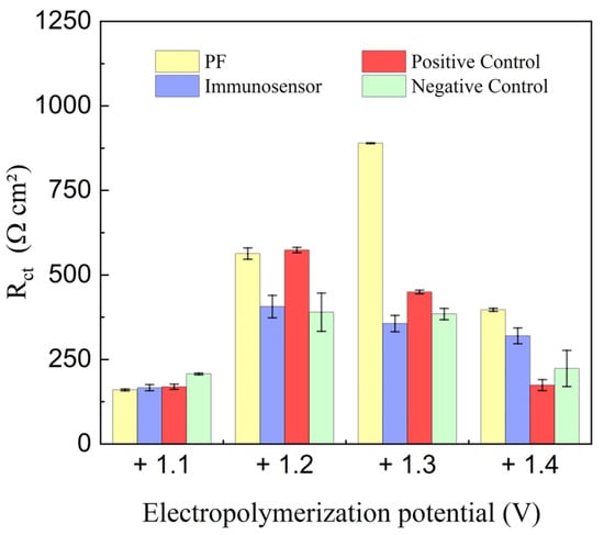 Electropolymerization potentials ranging from +1.10 to +1.40 V were tested, and the results are illustrated in Figure 6. The most suitable potentials for PF formation were identified as +1.20 V and +1.30 V, primarily due to the increased charge transfer resistance observed during the impedimetric detection of VACV in positive controls. However, the potential of +1.10 V was not ideal. Electrochemically, this potential is close to the oxidation potential of the monomer, leading to fewer radicals being available for polymer film formation. This results in low resistance associated with the formed film, indicating insufficient PF formation, which hinders efficient immobilization during immunosensor construction.