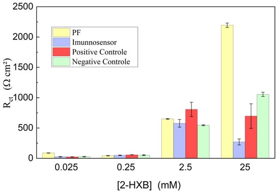 Resistances to charge transfer were obtained for the immunosensor, including interactions with the controls (positive and negative) as a function of the concentration of 2-HXB.