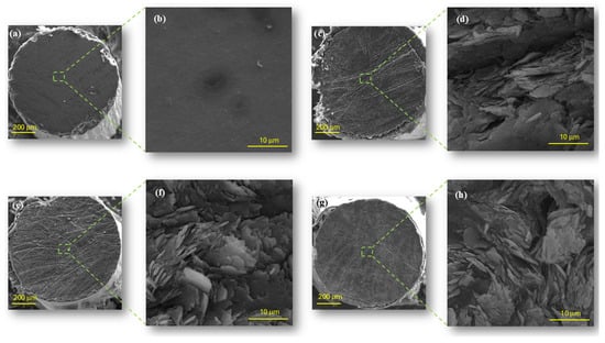SEM images obtained for the PGE at different magnifications (200× and 5000×), where (a,b) PGE; (c,d) PGE polished with 600 grit water sandpaper; (e,f) PGE after the electrochemical activation step; and (g,h) PGE functionalized with poly(2-HXB).