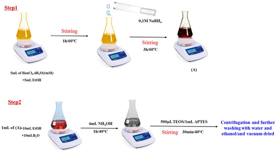 The synthesis of Au@SiO2-APTES nanocomposites was performed in two steps. Firstly, Au NPs were prepared using a solution containing 5 mL of 1 mmolL−1 HAuCl3·4H2O and 5 mL of EtOH. The solution was heated at 60 °C and stirred for 1 h, after which 0.1 molL−1 NaBH4 (2 mL) was added, and the mixture was stirred for a another 3 h at the same temperature. During this time, the colour changed from yellow to wine red, confirming the reduction of Au3+ ions and the formation of the Au NPs (Figure 1, step 1).