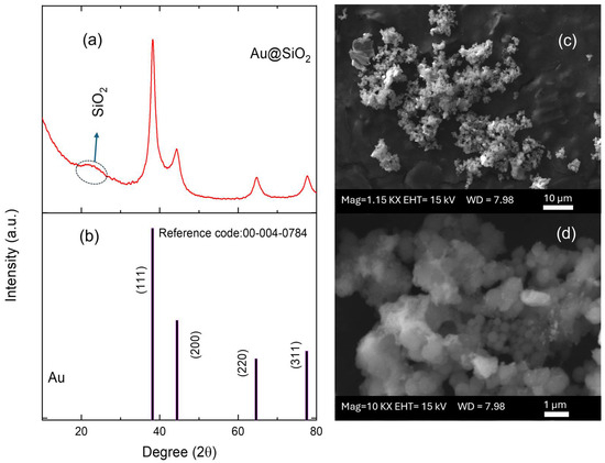 (a) XRD pattern of the Au@SiO2-APTES composite and (b) JCPDS reference pattern. (c,d) SEM micrographs for the Au@SiO2-APTES composite deposited on screen-printed electrodes.