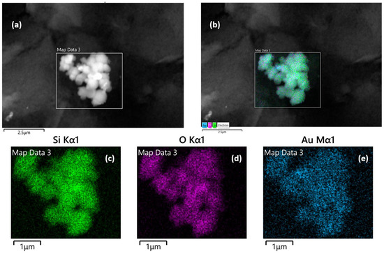 Energy-dispersive X-ray mapping analysis of Au@SiO2-APTES NPs. (a) Selected region of interest for mapping, (b) overall elemental composition mapping, accompanied by individual elemental mapping images for (c) silicon (Si), (d) oxygen (O), and (e) gold (Au).