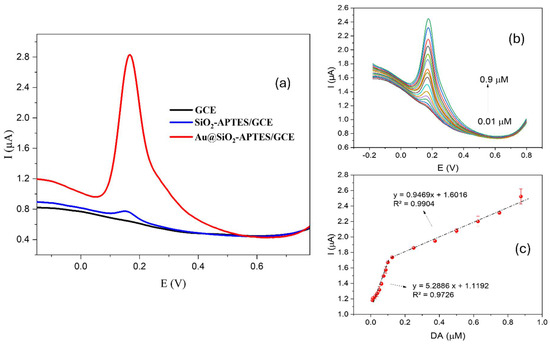 To assess the sensor’s effectiveness, the response to 1 × 10−5 molL−1 DA was tested across different sensor configurations, ranging from the simplest (bare GCE) to the proposed sensor (Au@SiO2-APTES/GCE). The response of an electrode modified with APTES (SiO2-APTES/GCE) in the absence of Au NPs was also evaluated to demonstrate the catalytic effect of the proposed hybrid structure. As shown in Figure 6a, the GCE showed no response to the tested concentration under optimal experimental conditions. In contrast, the SiO2-APTES/GCE configuration showed a positive response to the tested concentration with a peak current of about 0.08 µA. Finally, the hybrid configuration proposed (Au@SiO2-APTES/GCE) here showed a significant improvement, reaching a peak current of about 2 µA, which is 25 times higher than the intermediate configuration. This notable enhancement can be ascribed to the incorporation of gold nanoparticles within the hybrid composite, which probably facilitates electron transfer and increases the electroactive surface area, thereby improving the sensitivity and catalytic efficiency of the sensor.