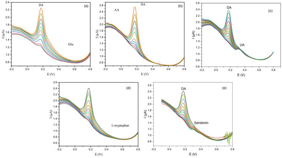 Raw DPV curves of Au@SiO2-APTES/GCE for dopamine (DA) at different concentrations ranging from 0.375 to 0.875 µmolL−1 of DA (accumulation time = 5 min) in the presence of different potential interferences at a fixed concentration: (a) glucose (Glu) (10−3 molL−1), (b) ascorbic acid (AA) (10−4 molL−1), (c) uric acid (UA) (10−3 molL−1), (d) L-tryptophan (10−4 molL−1), (e) serotonin (10−3 molL−1).