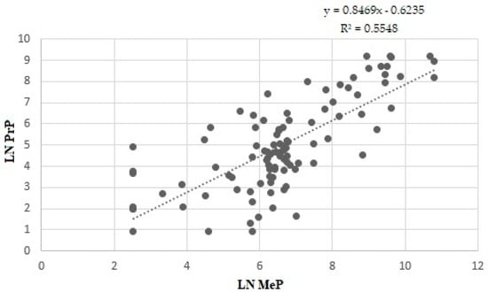 A correlation was observed between the natural logarithm of MeP (Ln MeP) and PrP (Ln PrP) in the scatter plot, with the equation y = 0.8469x − 0.6235 (r2 = 0.5781). This indicates that the linear model explains 57.81% of the variation in the data. Pearson’s correlation coefficient (r = 0.78) confirmed a strong positive linear relationship between the two variables (Figure 2).