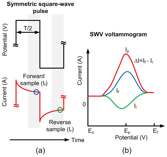 Square wave voltammetry, together with normal and differential pulse voltammetry, is an electrochemical technique specifically used to reduce the capacitive background current of the working electrode [15,16,17]. Simultaneously, it aims to optimize the signal-to-noise ratio of the Faradic currents associated with oxidation and reduction processes.