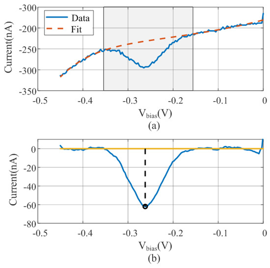 The baseline is estimated from the fifth-order polynomial fit using the entire bias range and is subtracted from the measured data. As a preliminary step to peak searching, a moving average filter is applied to smooth the curve and remove noise. A flowchart diagram is shown in Figure 4. An example illustrating the operation of the algorithm with measured data is depicted in Figure 3. Figure 3a shows the raw data and the fitted polynomial using the points outside the windows. The result of the baseline subtraction and the noise reduction achieved by smoothing with the moving averaging filter is shown in Figure 3b. The minimum obtained is also highlighted in this figure.