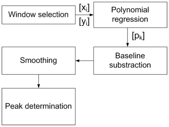 Flowchart of signal processing applied to the measured data to determine the peak height after subtracting the baseline estimated by polynomial regression from points outside the peak region.