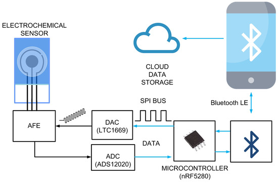 Schema of the proposed system. The microcontroller configures the DAC to generate the SWV waveform. For each pulse step, the forward and reverse currents at the output of the analog front end (AFE) are measured by the ADC. Communication between the ADC and the DAC with the microcontroller is done through the serial peripheral interface (SPI) bus. Once the scan is completed and the measurements are processed, the peak current is determined. The microcontroller then transmits the processed information to the mobile device via Bluetooth Low Energy (BLE). The results are subsequently uploaded to a cloud database. The system is controlled by the mobile app through BLE.