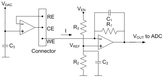 The Analog front-end (AFE), which interacts directly with the electrochemical cell, includes a potentiostat [25,26,27,28], consisting of two operational amplifiers (OpAmp) with simple biasing that allow minimizing their power consumption [29] (see Figure 8). The reference electrode voltage is adjustable from the DAC output (). In turn, the working electrode is fixed to a obtained from a resistive voltage divider connected to a digital output of the microcontroller . The second OpAmp is configured as a transimpedance amplifier (TIA). The TIA amplifies the current flowing between the CE and WE electrodes through the feedback resistance, , and converts it into an output voltage, . The advantages of this design based on OpAmps are the negligible input current, the high input impedance, and the low input offset voltage. In this work, a low-noise rail-to-rail CMOS dual OpAmp OPA2314 from Texas Instruments Inc., USA is selected. Its specifications include the following: 3 MHz gain-bandwidth product, 0.2 pA input bias current, 150 A current per channel, and operating voltages starting at 1.8 V. The DAC output () and the digital output () are triggered by the microcontroller at the same time. Bypass capacitors and of value 10 nF have been included to filter noise from the supply. is a feedback capacitor whose function is to low-pass filter the signal to reduce noise at the output. The cut-off frequency of the filter is calculated using the following expression: