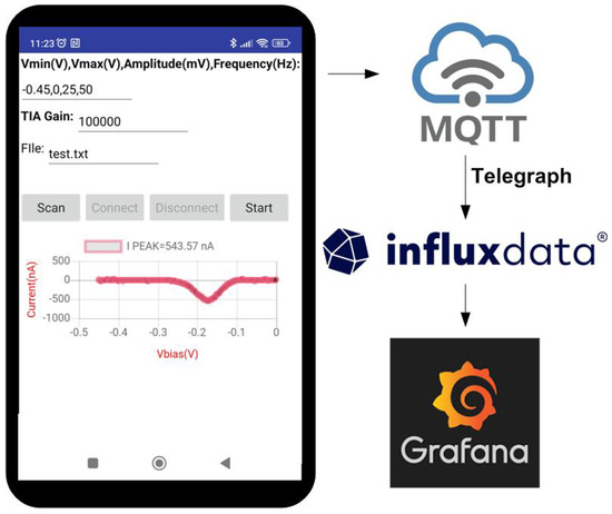 The designed board can be controlled via a universal serial bus (USB) from MATLAB or Python from a personal computer, or Bluetooth Low Energy from the smartphone. An Android app is developed to read the data, perform the calibration, and send the measured data by MQTT to a broker (see screenshot of a simple test app developed for Android in Figure 9). A number is used to identify the load cell. One topic is used for each load cell, and two subtopics were defined: one for the calibration parameters and the other for the measured data. The data are stored in a database. To this end, an influx DB database was chosen. The Grafana dashboard was chosen for data visualization. Telegraph server is used to subscribe to MQTT topics and store the data in the Influx database. A block diagram is shown in Figure 9. By using this structure, high scalable and configurable systems can be created without the need to program complicated back-end platforms.
