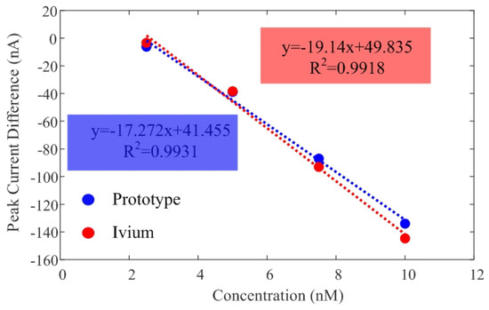 Additionally, Figure 11 illustrates the peak current difference () between the target and the background current in PBS. Currents measured with the low-cost prototype and the commercial Ivium electrochemical analyzer show good agreement. Table 3 compares the sensitivity and the limit of detection (LOD), estimated from the slope of the calibration curve and the calibration equation solver for there times the standard deviation, respectively. The Limit of Detection (LOD) obtained is approximately 2.5 nM in both systems.