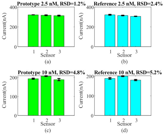 The reproducibility and repeatability of the sensor were evaluated by performing SQW measurements for detection concentrations of 2.5 nM and 10 nM of DNA within a PBS solution. For this test, three different sensors were prepared under identical conditions. Figure 12 shows the measured peak current height for the two systems, the prototype and the reference Ivium analyzer. Relative standard deviation (RSD) values of 1.2% and 2.45% at 2.5 nM, and 4.8% and 5.2% at 10 nM, respectively, were obtained. The RSD is similar for the two systems, confirming good sensor-to-sensor consistency. The repeatability between measurements, shown in Figure 13, was evaluated based on the relative standard deviation (RSD) of ten measurements between measurements for each sensor. The results show it to be less than 4%.